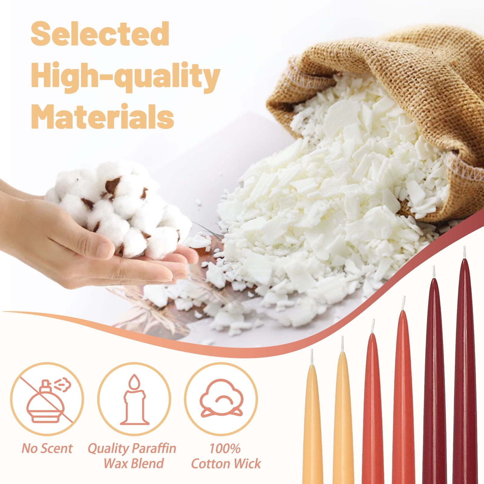The taper candle uses a wick made of pure cotton lead-free environmentally friendly dyes, and burning time up to 5-7 hours