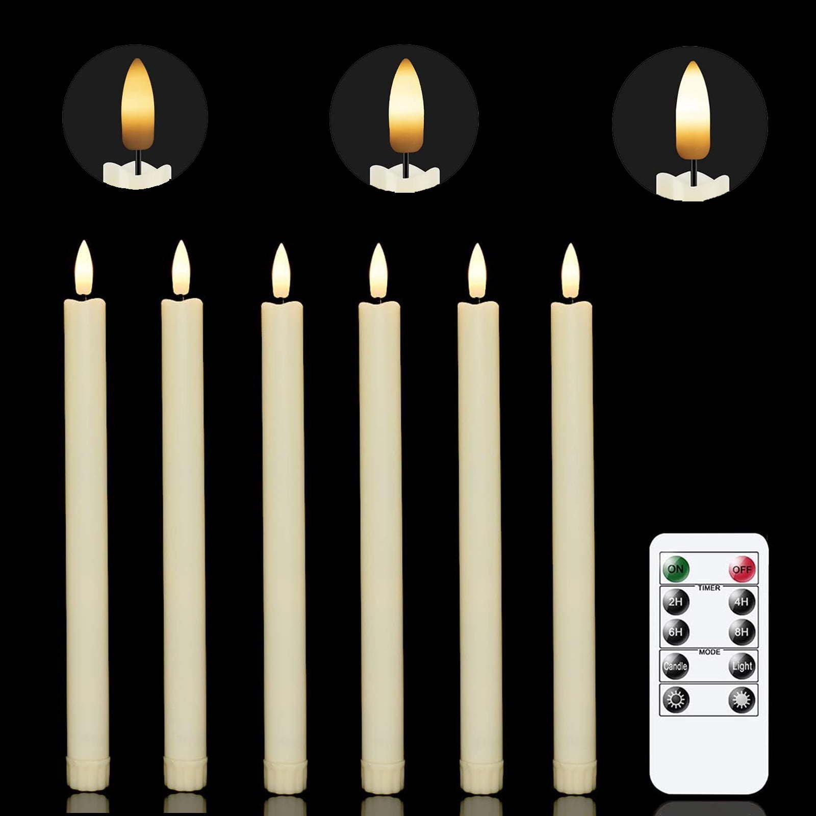 A COMPLETE SET OF FLAMELESS TAPER CANDLES: This value pack comes with 6 beautiful flickering flameless taper candles, one remote control with 10 different keys and a super easy to follow operating manual. Specifically, this set includes six flickering flameless taper candles
