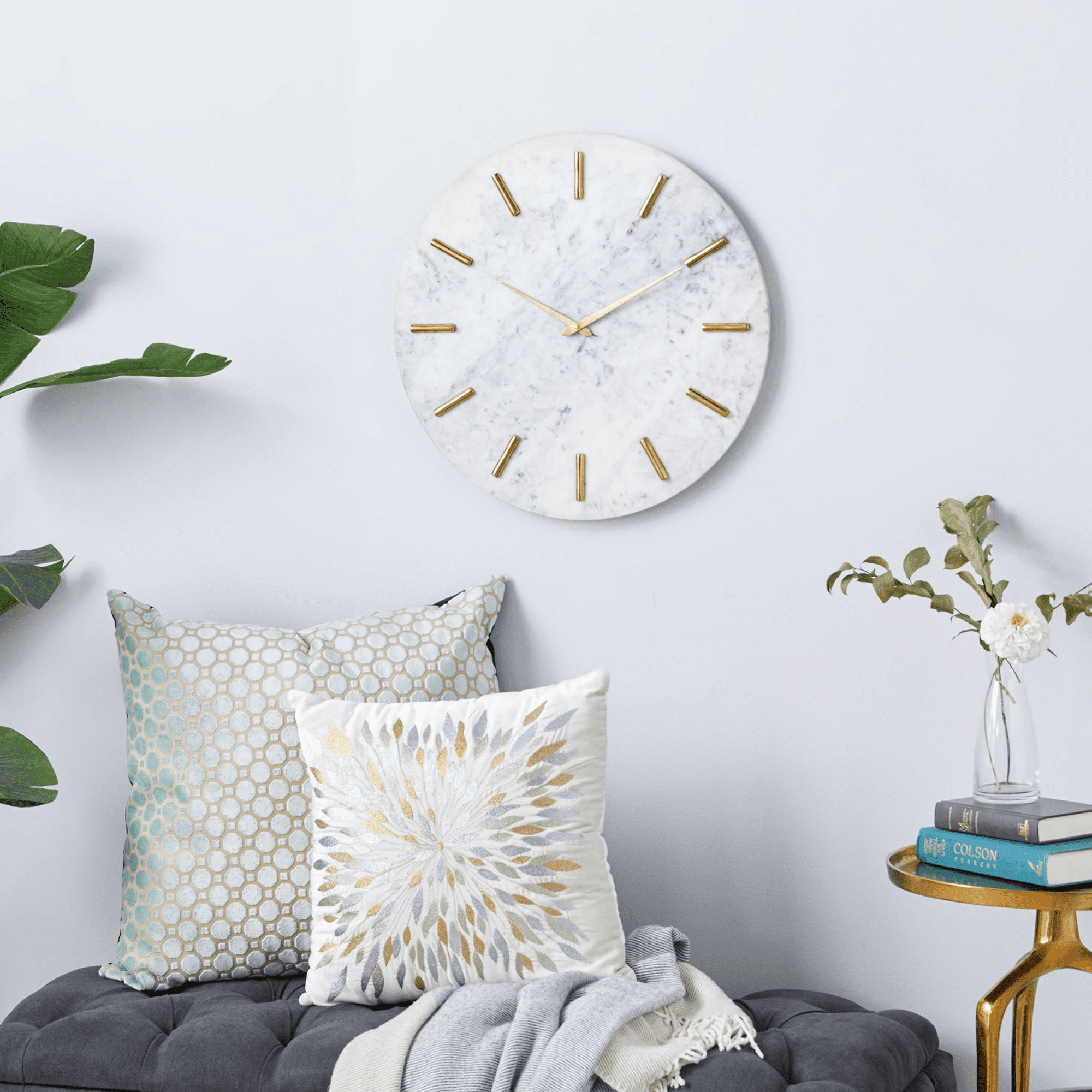 Cosmoliving by cosmopolitan 20" white marble wall clock with gold accents is a unique addition to your stylish home. Solid design with marble background provide an unmatched level of sophistication that will stand out in any background. Requires 1 aa battery, not included. This item ships in 1 carton. Open design with vertical dash markers. The clock mechanism runs silent. Can be hung vertically using the keyholes on the back; nails and screws not included. Suitable for indoor use only. This item ships fully assembled in one piece. Marble is a product of nature and no two pieces are exactly alike. It is prone to variations in color and/or patterns in the material that add to the beauty and charm of the piece.. Made in india. This is a single white colored kitchen clock. Contemporary style.