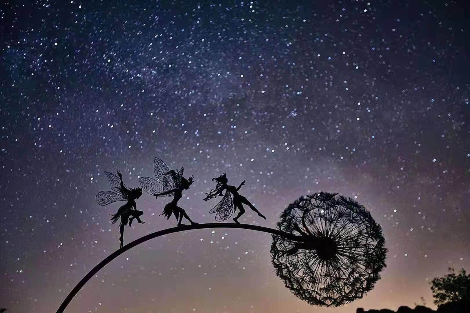 1. FAIRY PLAYING ON/WITH THE DANDELION: They are charming fairy sculptures made of metal. Each one is full of vigor and vitality; as if it might jump away and disappear with the elves' smirk at any time.