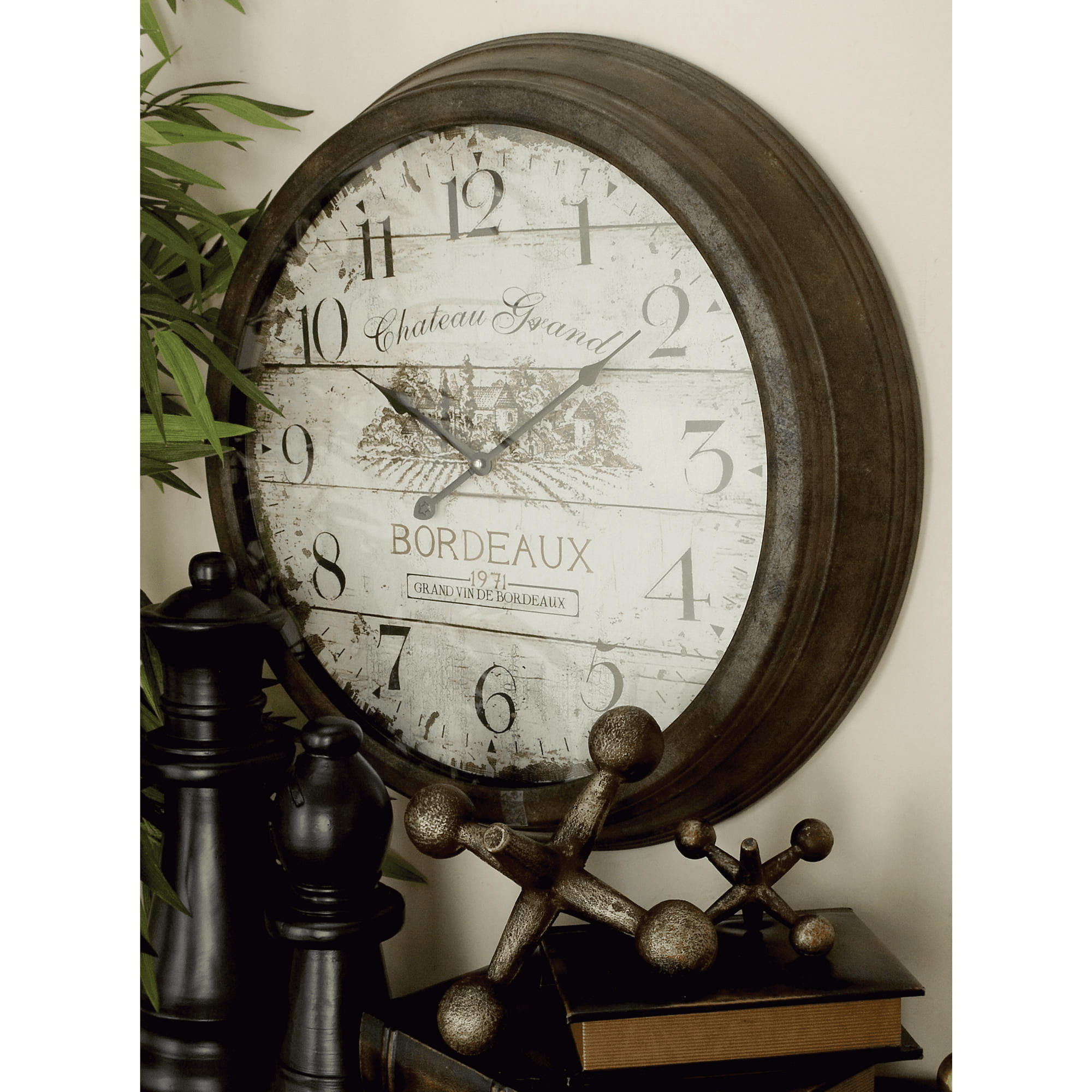 This antique-inspired big metal wall clock features a tarnished brown and distressed white iron finishes
