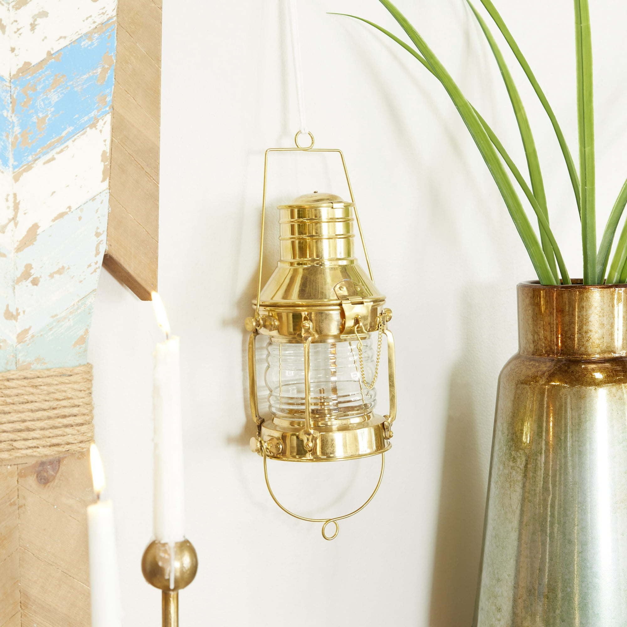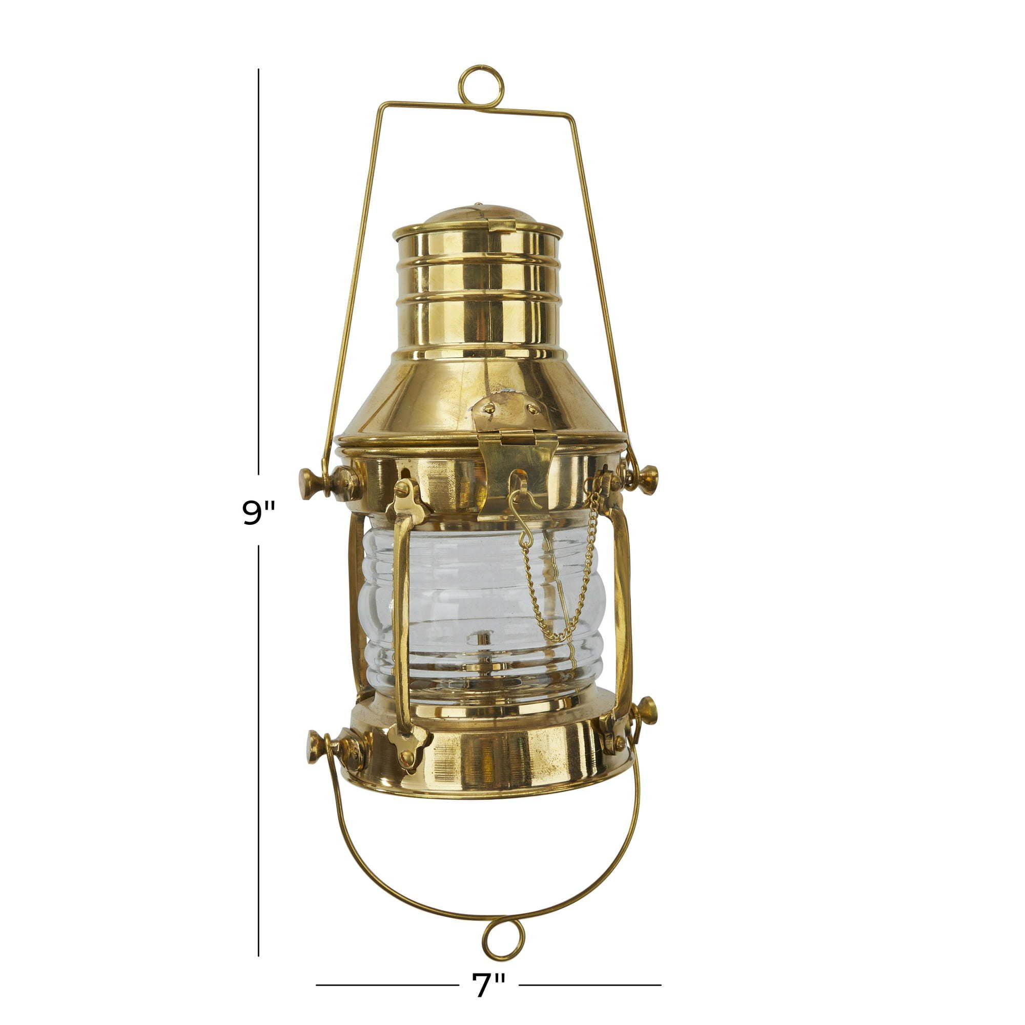 DecMode Gold Brass Decorative Candle Lantern with Handle is a unique addition to your stylish home. Delight your guests and make any occasion extra special by adding a lighted or flameless candle to this lantern. Made with a sturdy base, it is perfect for creating an elegant atmosphere at your table top or mantel. Add this nautical-inspired hanging lantern to your indoor space for a traditional yet chic ambience. Designed with felt or rubber stoppers at the base that prevent scratching furniture and table tops, as well as sliding around. Can hold one pillar candle, not included. This item ships in 1 carton. Please note that this item is for decorative use only. Suitable for indoor use only. This item ships fully assembled in one piece. Made in India. This is a single gold colored lantern candle holder. Nautical style.