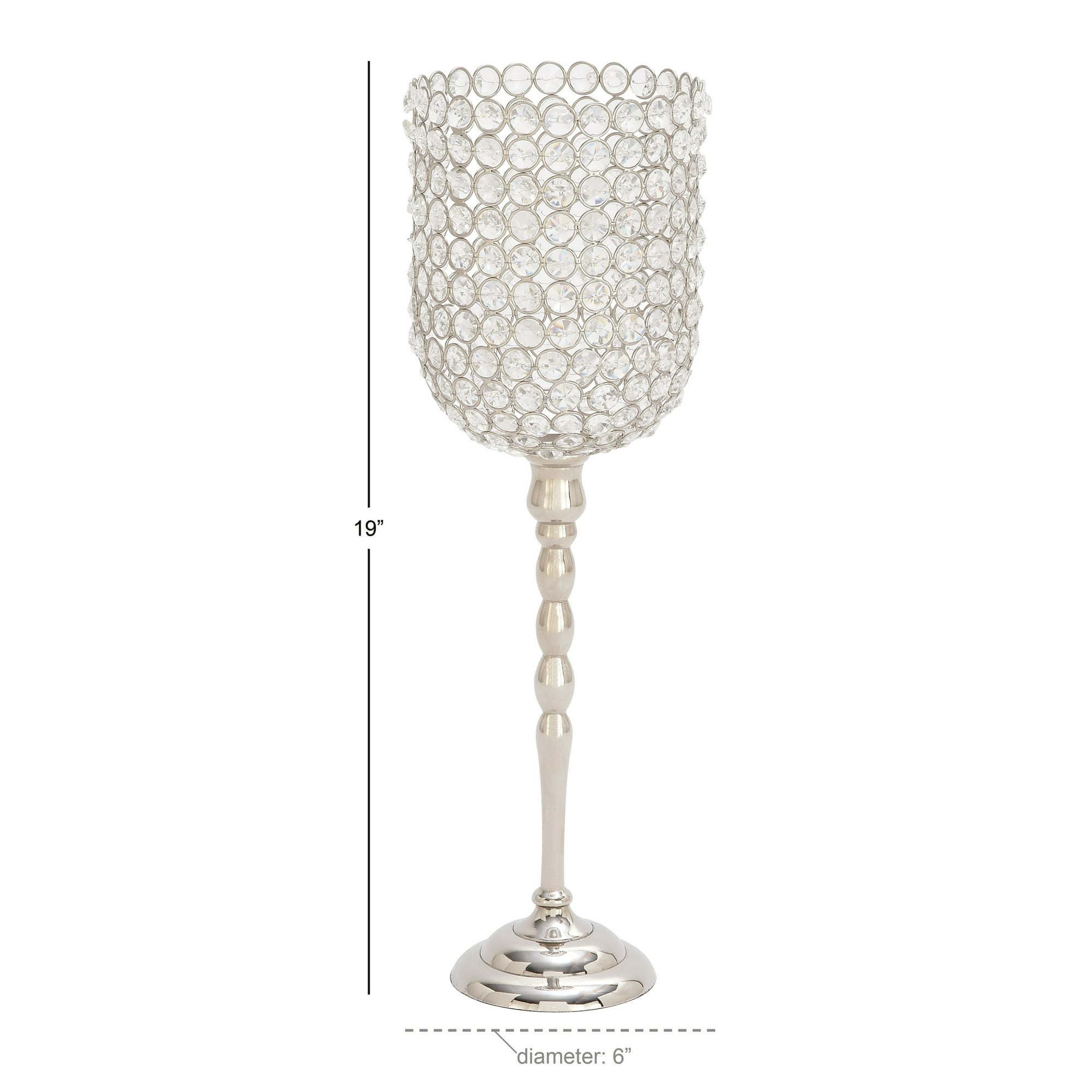 DecMode Silver Aluminum Single Candle Hurricane Lamp is a unique addition to your stylish home. Brighten up any room to create a warming atmosphere for you and your guests with this chic hurricane lamp candle holder. Make a statement with this unique charming hurricane lamp on any surface space for a balanced look. Display as accent or centerpiece decor on your console, coffee, or dining table. Designed with felt or rubber stoppers at the base that prevent scratching furniture and table tops, as well as sliding around. Can hold 1 votive candle, not included. This item ships in 1 carton. Suitable for indoor use only. Some assembly required. Made in India. This is a single silver colored hurricane candle holder. Glam style.