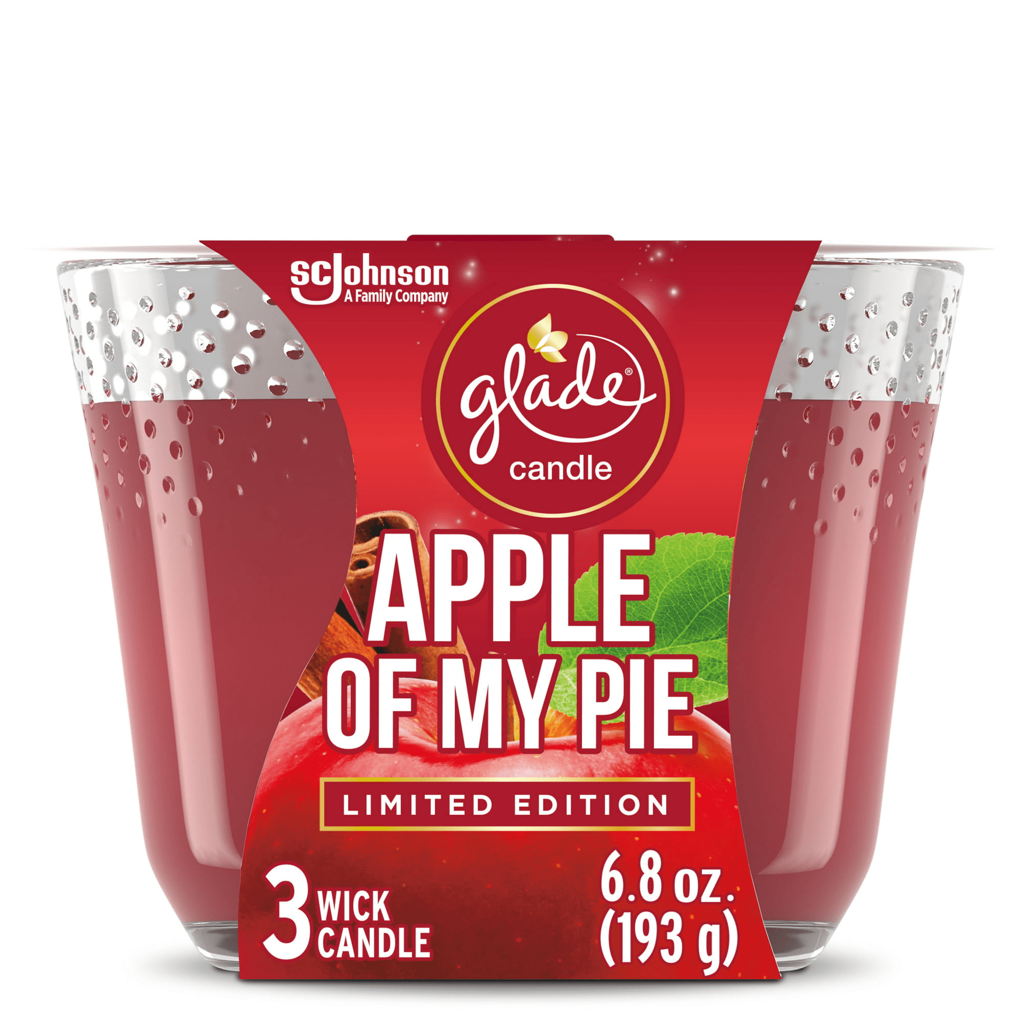 Stir up the season with apple of my pie glade 3 wick scented candles. This limited edition apple scented glass jar candle is a great way to add a little glam, allure and excitement to any party or gathering with fall scents and festive fragrance.Glade apple of my pie glass candle features a warm blend of gala apple, cinnamon, and baked crisp to create an alluring mood for festive fun. These glade fall scents are crafted by master perfumers and infused with essential oils. This three wick candle in glass fills the room with festive fragrance 3x faster (vs. Glade single wick candles).Looking for great gift ideas? Why not share the joy of good smelling candles by gifting these triple wick candles to friends and loved ones.The glade holiday spirit collection is a range of limited-time-only glade scents that will get you in the mood to put on your party hat. Make home scents festive scents this fall with america's #1 selling fall fragrance brand*.*sc johnson and son, inc. Calculation based in part on data reported by nielseniq through its scantrack service for the home air freshener category for the 13-week period ending 10/02/21, for the total u.S. Market, xaoc, according to the nielseniq standard product hierarchy. Copyright © 2022, nielsen consumer llc