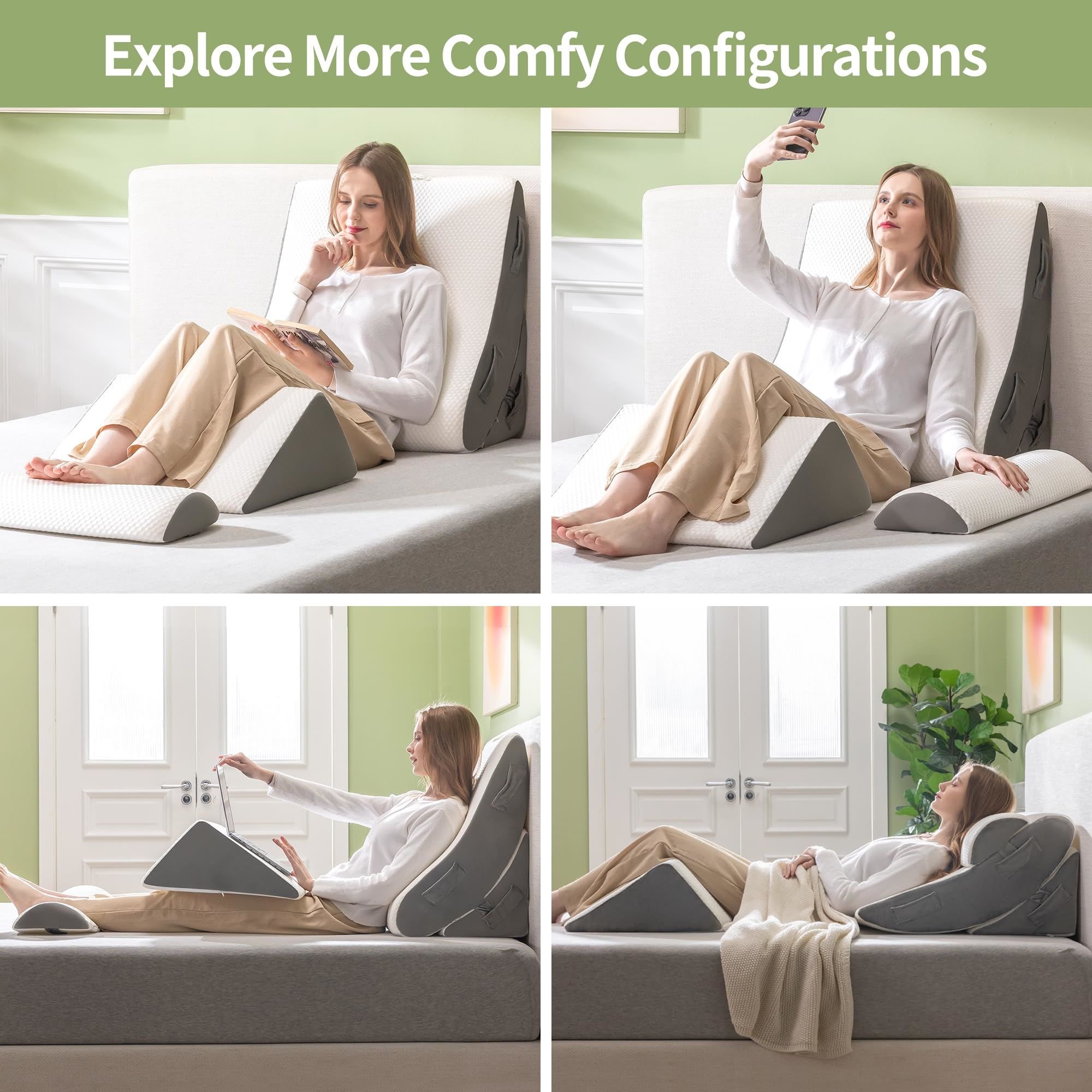 • MULTIFUNCTIONAL WEDGE PILLOW: Hcore surgery pillow set consists of four parts that can be combined. Choose a proper angle for sitting up, lying down and sleeping on the adjustable back pillows. Leg elevation pillow can relieve discomfort and pressure on the legs and knees. The elongated foam wedge pillow can be used to support the head or as an arm pillow.