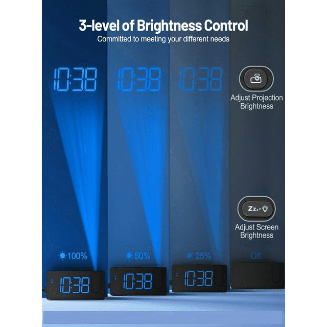 ✔ [integrated projector with a sharp and clear image] -- the arm of this digital clock swivels 180 degrees for optimum positioning, getting the fine and smooth time figure image on the wall or ceiling at the appropriate distance of 1.64-11.4ft(0.5-3m). The edges of the projected numerals are surprisingly sharp and clear without having to fiddle with a focus adjustment like other projection clocks. Different from other projection alarm clocks, our digital clock's brightness of the projection is adjustable, you can adjust to the brightness you want, so that you can see the time when you open your eyes at night without irritate your eyes or affect sleep, because the blue light is friendly to the eyes.