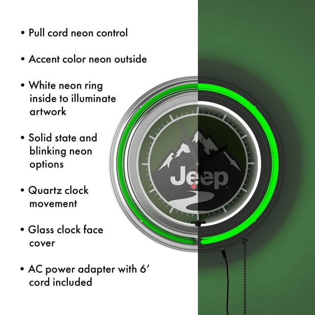 This officially licensed neon wall clock is the perfect addition to any game room, garage or man cave. This impressive clock has two neon rings; one is an accent colored neon ring on the exterior and the other is a brilliant white neon ring on the interior of the clock to light up your favorite logo. Other highlights include chrome finished resin housing and a high-grade glass clock face cover. The battery-operated quartz clock mechanism will keep it ticking for a long time, while the neon runs off the included ac adapter. The neon is controlled by the pull chain and the back of the clock includes a wall hanging mount and has two modes � solid state and blinking. The 3 in depth of this clock combined with the radiant shimmer of the neon reflecting off the chrome housing is sure to make this clock pop on any wall!