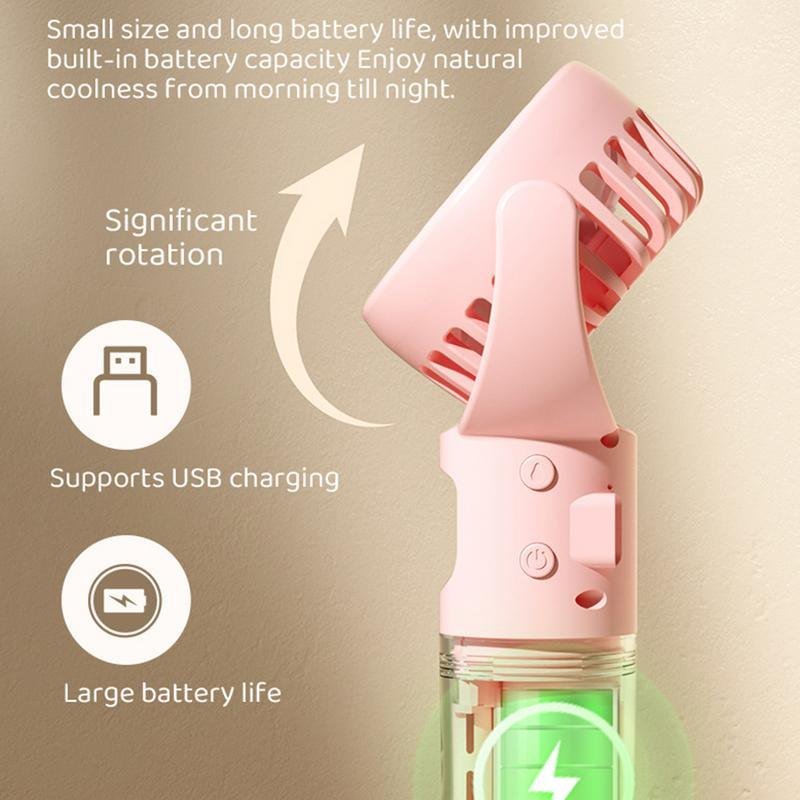 1.More Coolness: Equipped with a built-in 800mAh large-capacity battery, this portable handheld misting fan ensures convenience and a light-hearted experience, offering super long battery life to enjoy sustained coolness and moisture outdoors.