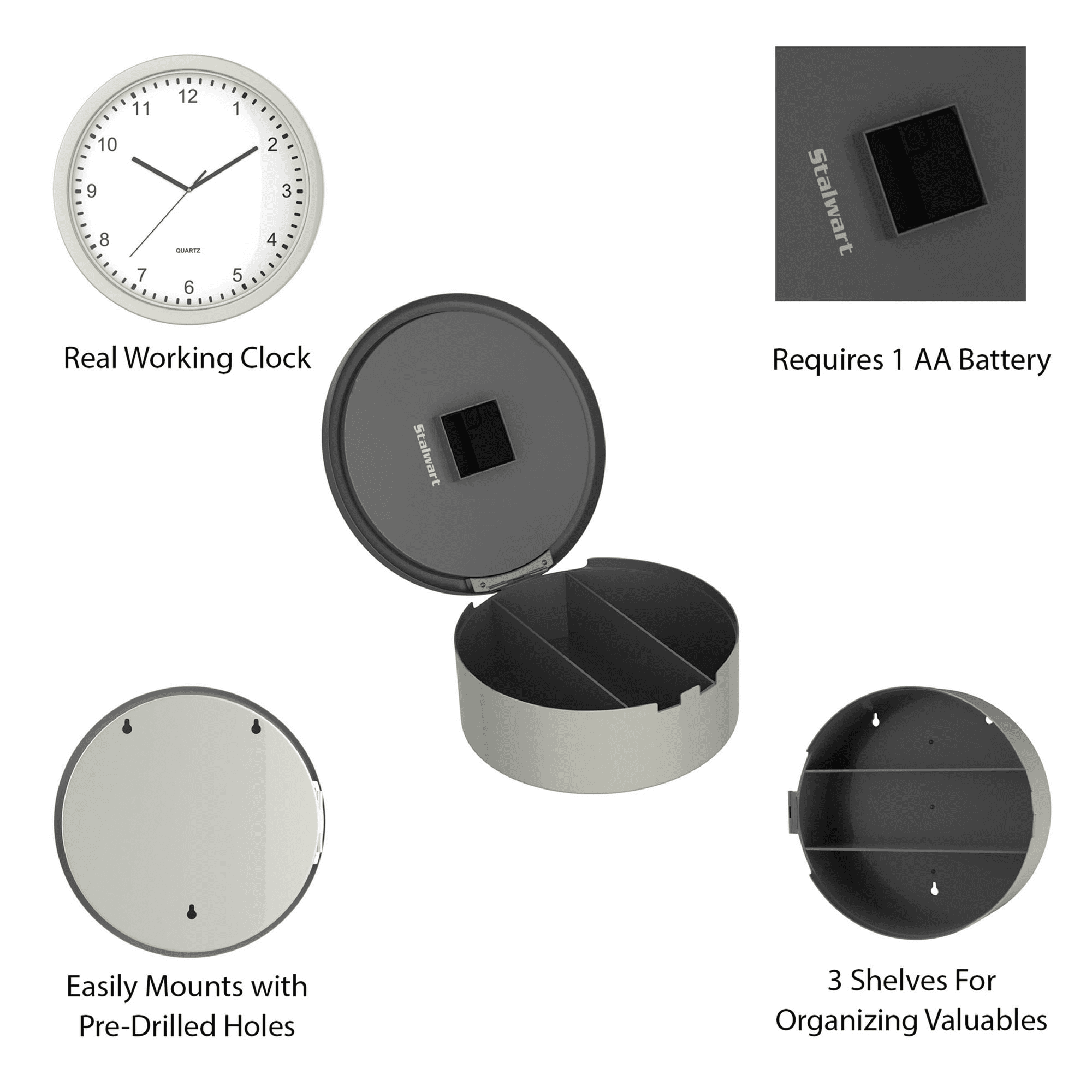 Multiple storage shelves – two shelves within the stash compartment make three divided spaces to maximize the number of small objects that can be stored behind the face of the clock.